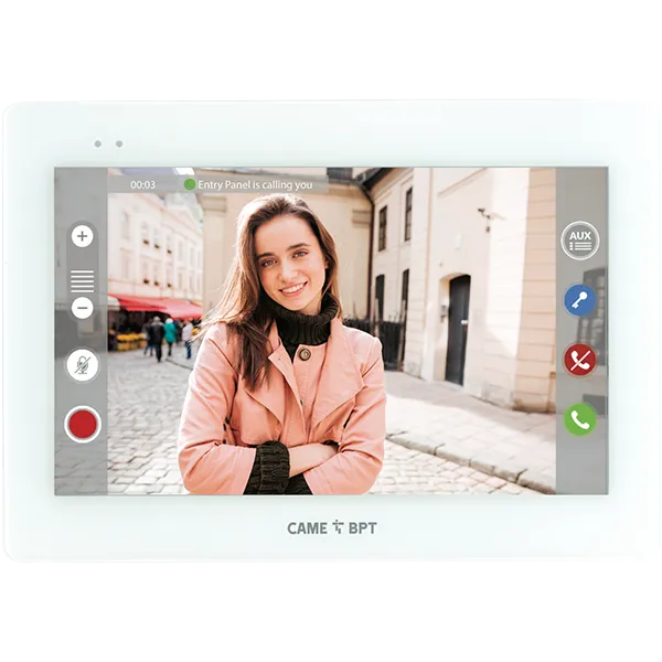Moniteur mural blanc avec écran tactile TFT 7˝ à technologie Optical Bonding, WiFi incorporé pour la commande à distance de l’appel sur smartphone avec app dédiée. Interface utilisateur pour la gestion de fonctions visiophoniques, appels intercom, répondeur vidéo. Utilise le protocole SIP et le codec audio G711 et vidéo H.264. Alimentation locale 14-18VDC. Serveur Web incorporé pour la configuration et les mises à jour du firmware. Fourni avec un étrier pour la pose en applique murale sur boîtier 503 (horizontal) et sur boîtier rond Ø 60 mm. Prévu pour une pose en encastrement avec boîtier dédié. Compatible avec les systèmes X1 et XIP.